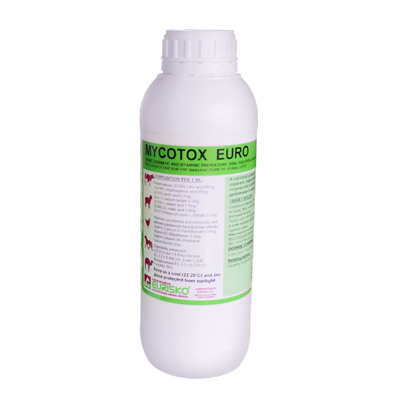 MYCOTOX EURO est une solution buvable à usage vétérinaire conçue pour améliorer les performances des animaux en cas de mycotoxicose et de stress mycotoxinique.