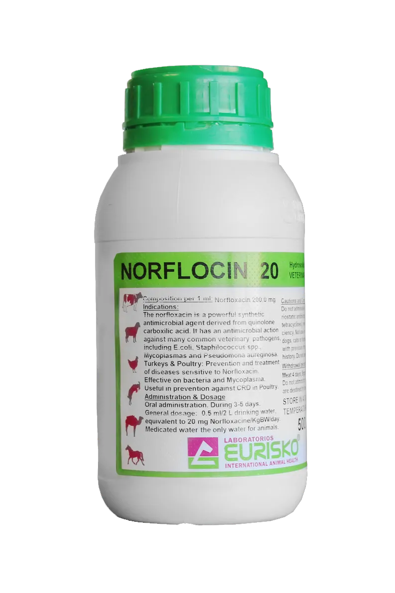 La norfloxacine est un puissant agent antimicrobien synthétique dérivé des quinolones. Elle agit contre E. coli, Haemophilus spp., Staphylococcus spp., Mycoplasma, Campylobacter spp., Pseudomonas spp. et Streptococcus spp.
